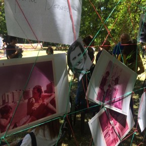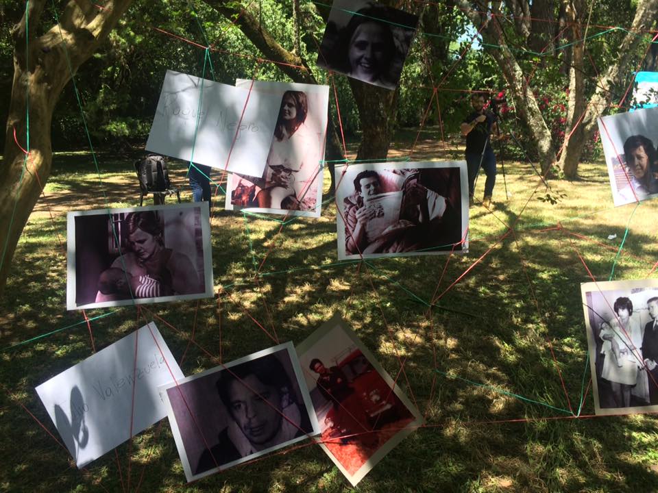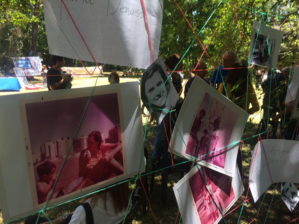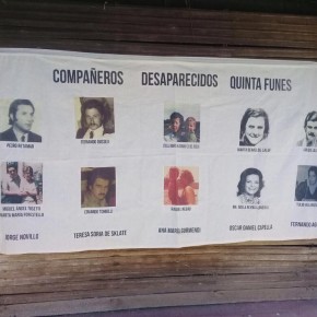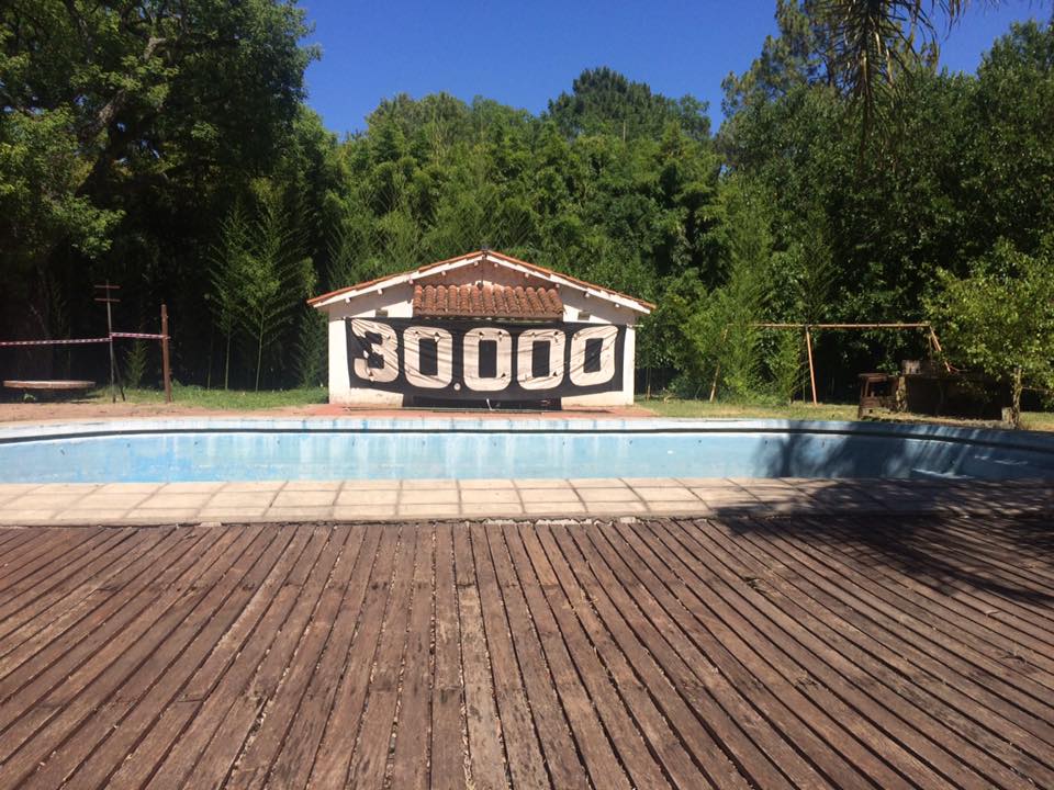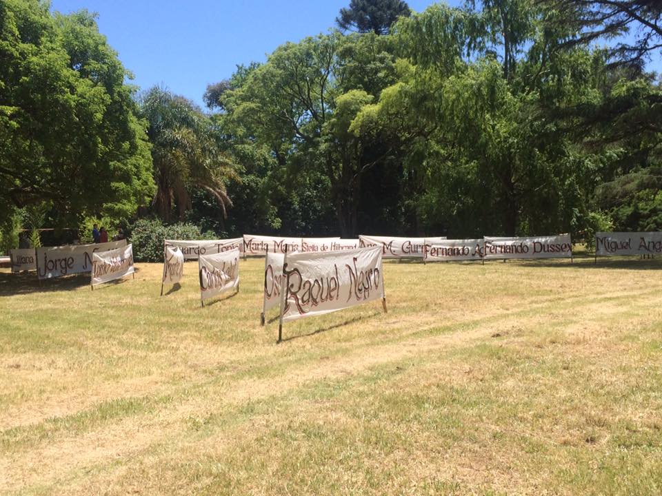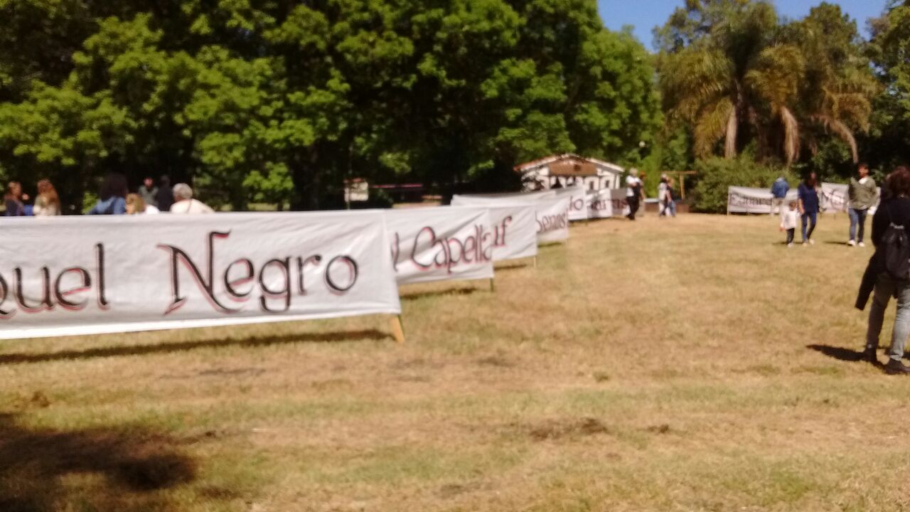 El parque estaba repleto con carteles que llevaban el nombre de los detenidos y que formaban un camino hasta el inmueble donde una bandera negra decía 30.000 en blanco. Había también entramados de hilos con fotos de las víctimas y espacios con talleres como por ejemplo de mosaiquismo.