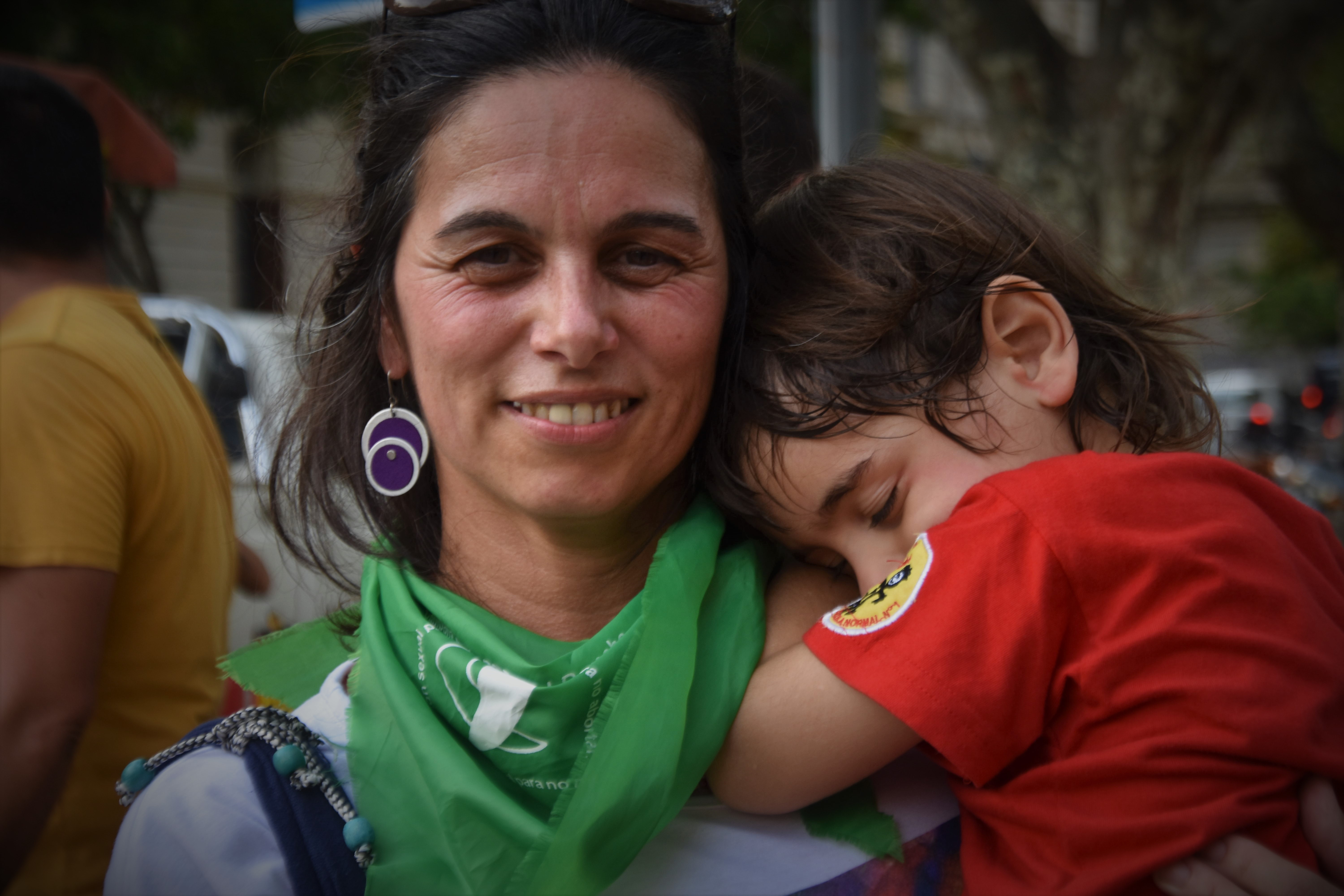“Amamos la vida y por eso, tenemos que decidir qué hacer cuando tenemos una situación de embarazo. Como lo personal es político también recordamos la historia y la lucha. Nunca nos vamos a olvidar de nuestras compañeras históricas y vemos el futuro cuando vemos a una piba de 15 o 14 años con el pañuelo y eso nos dice que son frutos del movimiento”, dice Mariana, la Negra, militante de Villa Banana. Romina milita en Hijos Rosario. Con su hijo en brazos, dice “tenemos derecho a decidir sobre nuestro cuerpo. Soy trabajadora social y estoy en espacios con mujeres que están en los márgenes y todo esto recae sobretodo en ellos que no tienen las mismas posibilidades que tienen otras mujeres. Abortar, abortamos todas”.