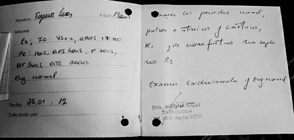 Información a la que accedió enREDando permiten, al menos, dudar sobre la causa de la muerte de Lucas Figueroa. Dudar, en principio. No juzgar, no sentenciar. Tampoco silenciar. La historia clínica de Lucas que se conserva en el Centro de Salud Mauricio Casals hace un recorrido de las intervenciones del Estado sobre la vida del chico hasta el año 2013 y también hay informes médicos. En ninguno de ellos se habla de “problemas congénitos” como dijo Travaini. Tampoco de afecciones cardiovasculares. Sino todo lo contrario. Un estudio fechado el 25 de enero de 2012 dice: “Examen cardiovascular y Electrocardiograma Normal. Pulsos rítmicos y simétricos. No soplos. No R3”. El R3 es un término médico para dar cuenta de un ruido que se escucha en exámenes del corazón en ocasiones de insuficiencia cardíaca. Aunque tampoco sea determinante, ningún funcionario presentó, al menos hasta el momento, alguna evidencia que dé cuenta de las supuestas enfermedades del chico. Directamente no hay, hoy, una certeza sobre las causas de la muerte.