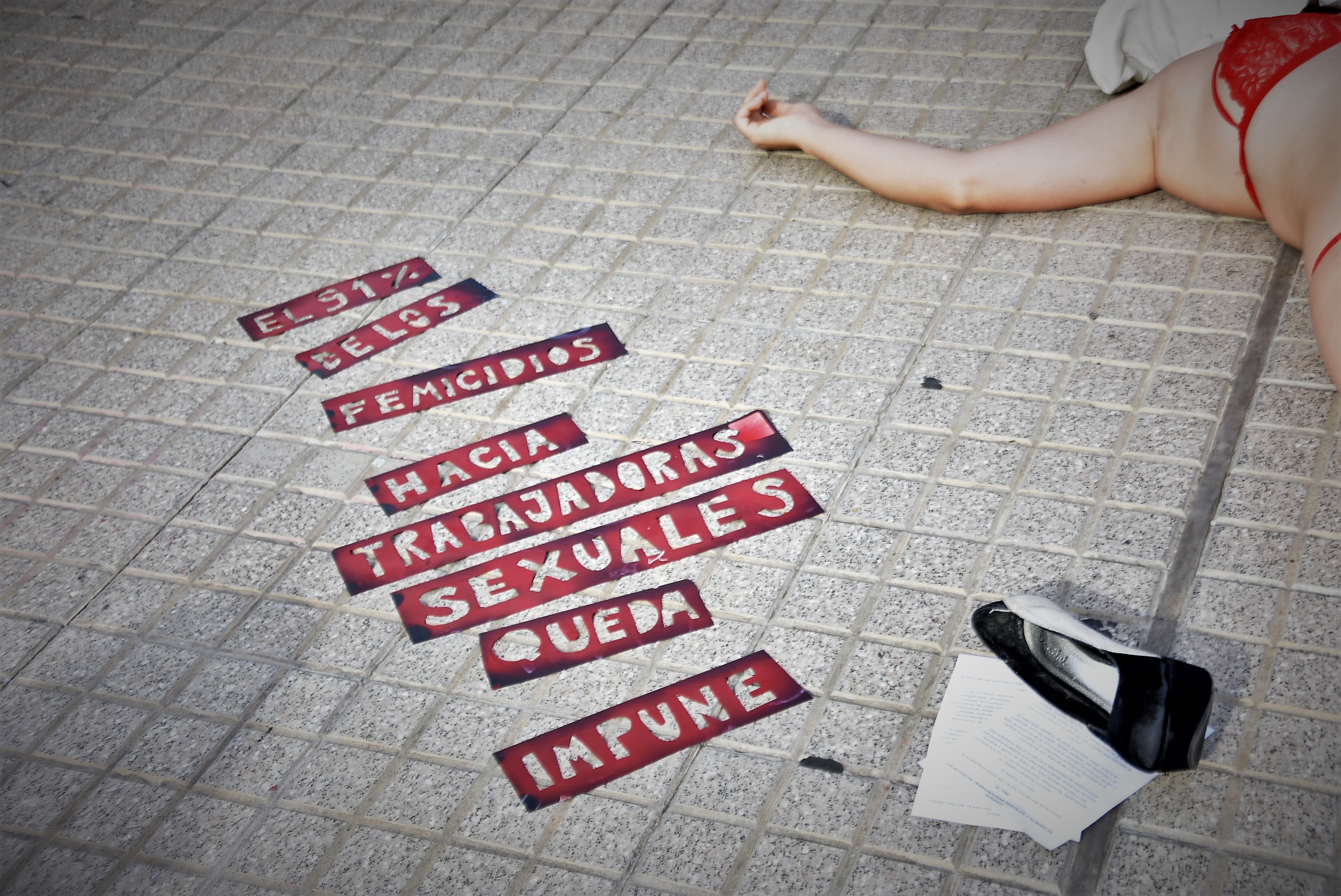 En la plaza, una intervención potente interpela. “El 91 por ciento de los asesinatos de las trabajadoras sexuales quedan impunes”. Junto al cartel, un cuerpo semidesnudo, con la cara tapada, tirado en el suelo. La imagen no necesita explicarse. Son las putas visibilizando la impunidad de crímenes que a la justicia y al Estado poco les importa.