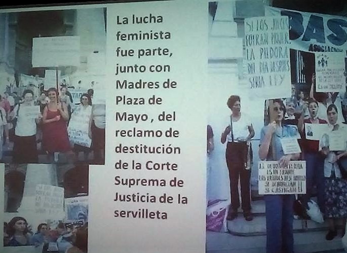 “Las Madres que empiezan a buscar a sus hijos, saliendo de sus roles tradicionales son las que más fuertemente enfrentan este poder represivo y patriarcal. Muchas de ellas empiezan a participar de los Encuentros Nacionales de Mujeres a hablar de sus hijos desaparecidos y van haciéndose feministas”, señala la antropóloga feminista Ana Gonzalez. Está en la ex ESMA, participando de ARDE, un encuentro de feminismo, fotografía y derechos humanos. Nada es casual. En esa espacio donde el horror y la memoria habitan en cada rincón del enorme predio ubicado sobre la Avenida Libertador, se desarrolla un encuentro autogestionado de feminismo. Hay pañuelos verdes por todas partes, muestras de fotos, talleres y conversatorios. Converge el pasado, estallado como dice la periodista Lilian Alba, y navega en estas olas de mareas verdes.