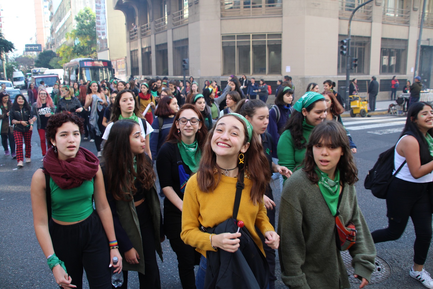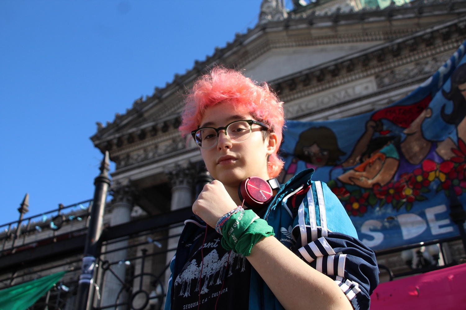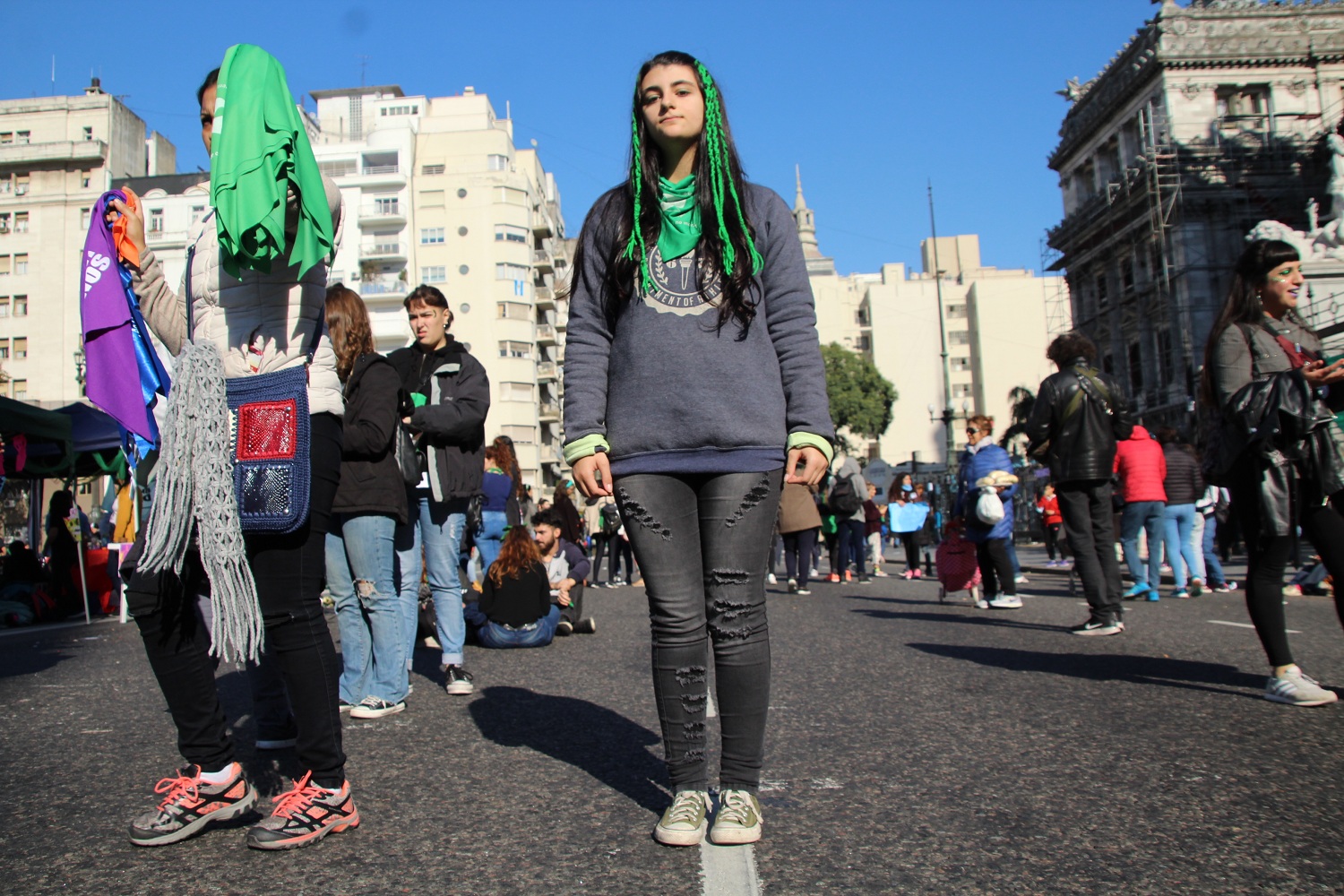 Aylén, 21 años. Dos largas trenzas de color verde la iluminan. “Es una emoción terrible estar acá, el 8 de marzo vine sola y hablé con un grupo de chicas y al toque ya éramos amigas. Me encanta venir a las marchas, hay una amistad hermosa”. Aylén habla también de la violencia obstétrica y de cómo son maltratadas muchas mujeres que llegan con complicaciones post aborto o incluso, con embarazos avanzados. Habla de las muertes por abortos clandestinos. Habla de la anticoncepción y dice que no hay información de cómo usarlos, de la dificultad en el acceso. Habla de lo que pasa en las escuelas católicas y de lo que no se habla en las escuelas católicas. Habla de la ESI y, al igual que Macarena, habla del deseo.