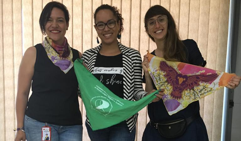 Antes de comenzar la entrevista, intercambiamos pañuelos, les doy el verde de la campaña por el aborto legal seguro y gratuito y me regalan el suyo, en colores violeta y amarillo con la búa (lechuza) que vigila noche y día, y las flores típicas de los árboles emblemáticos de Medellín.