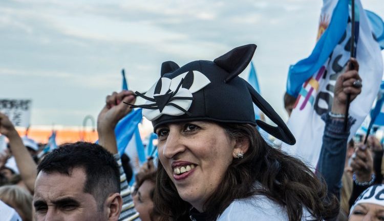 Es difícil evitar el simplismo de describir al público macrista por su estética. Para más o para menos es un detalle que condimenta. No es exagerada la conclusión: predominan los mayores de sesenta años –aunque también hay jóvenes- y los carteles con críticas a Cristina Fernández. Hay otros carteles mucho más difíciles de descifrar: si se trata de un cariño al presidente o de una mofa infiltrada. Lo tratan de gato, piden por el gato, que se quede el gato. Una señora, con su máscara de gato, sonríe todo el tiempo y mira más allá. A ver si lo ve llegar, al gato.