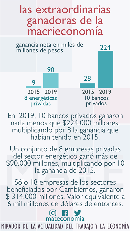En el 2019 solo 10 bancos privados ganaron nada menos que $224.000 millones, multiplicando por 8 la ganancia que habían tenido en el 2015. Un conjunto de 8 empresas privadas del sector energético ganó más de $90.000 millones multiplicando por 10 la ganancia obtenida en el 2015. Solo 18 empresas de los sectores beneficiados por Cambiemos ganaron $314.000 millones. Valor equivalente a 6 mil millones de dólares de entonces.