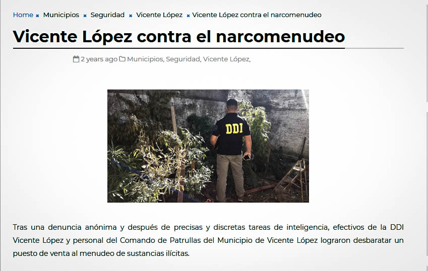 “Vicente López contra el narcomenudeo”, titularon las noticias locales que subieron el parte policial. Su desarrollo: “Tras una denuncia anónima y después de precisas y discretas tareas de inteligencia, efectivos de la DDI Vicente López y personal del Comando de Patrullas del Municipio de Vicente López lograron desbaratar un puesto de venta al menudeo de sustancias ilícitas. El allanamiento, ordenado por la fiscal Dra. Marcela Semería, se efectuó en la vivienda ubicada en la calle Gervasio Méndez al 2000, Florida Oeste, en la unidad funcional situada al fondo de un PH y arrojó como resultado la detención de dos mujeres y la incautación de drogas y elementos para su fragmentación y comercialización. Las detenidas Diana Denise M. y Luciana M., de 41 y 19 años respectivamente, fueron puestas a disposición de la justicia. Además, se secuestró un kilo y medio de cocaína, cuatro plantas de marihuana, semillas, pipas, dispositivos de corte, una balanza de precisión y seis celulares”.