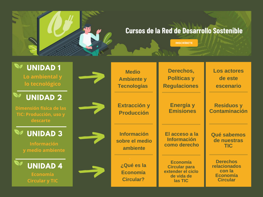 Con el fin de formar agentes de cambio en el entorno ambiental, a partir del conocimiento sobre el uso de dispositivos electrónicos y de internet, la Red de Desarrollo Sostenible, Colnodo y Nodo Tau, con el apoyo de la Asociación para el Progreso de las Comunicaciones – APC, invitan a participar en el curso TIC y Medio Ambiente en el que podrás comprender, dimensionar y promover acciones para ayudar a disminuir el daño ambiental; también podrás conocer la influencia de las TIC y su relación con el ambiente.