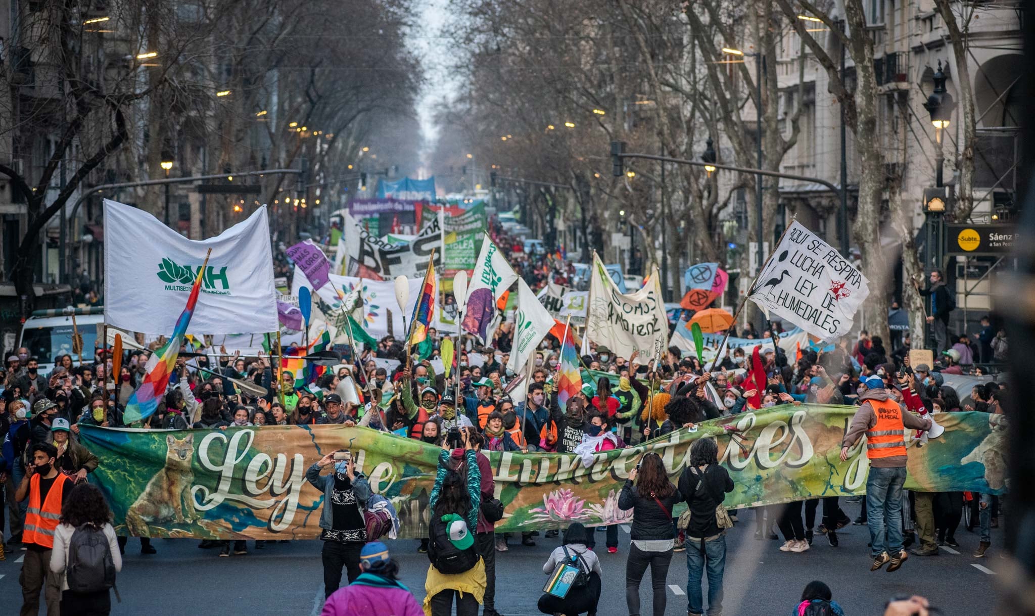 Entre la muchedumbre que va llegando a la plaza aparecen los kayakistas con sus botes en alto. No pasan desapercibidos porque no hay antecedentes de una marcha similar. El clima que se respira es tan litoraleño que impacta: en plena urbe porteña, frente a los medios hegemónicos más concentrados y más poderosos del país, la marcha de 5 mil personas es encabezada por una multisectorial de organizaciones parida en Rosario. No hay aparatos partidarios, no están los referentes sociales que más horas de televisión concentran ni figuras de la política nacional. Están los kayaks, lxs remerxs y copleras del río Paraná, las guardianas ancestrales de la Pachamama y el Abya Yala, las organizaciones ambientalistas que vienen bajando del Litoral, y detrás, las asambleas vecinales que en cada rincón de este país, se autoconvocan y autogestionan para defender un río, un arroyo o una laguna en peligro de extinción.
