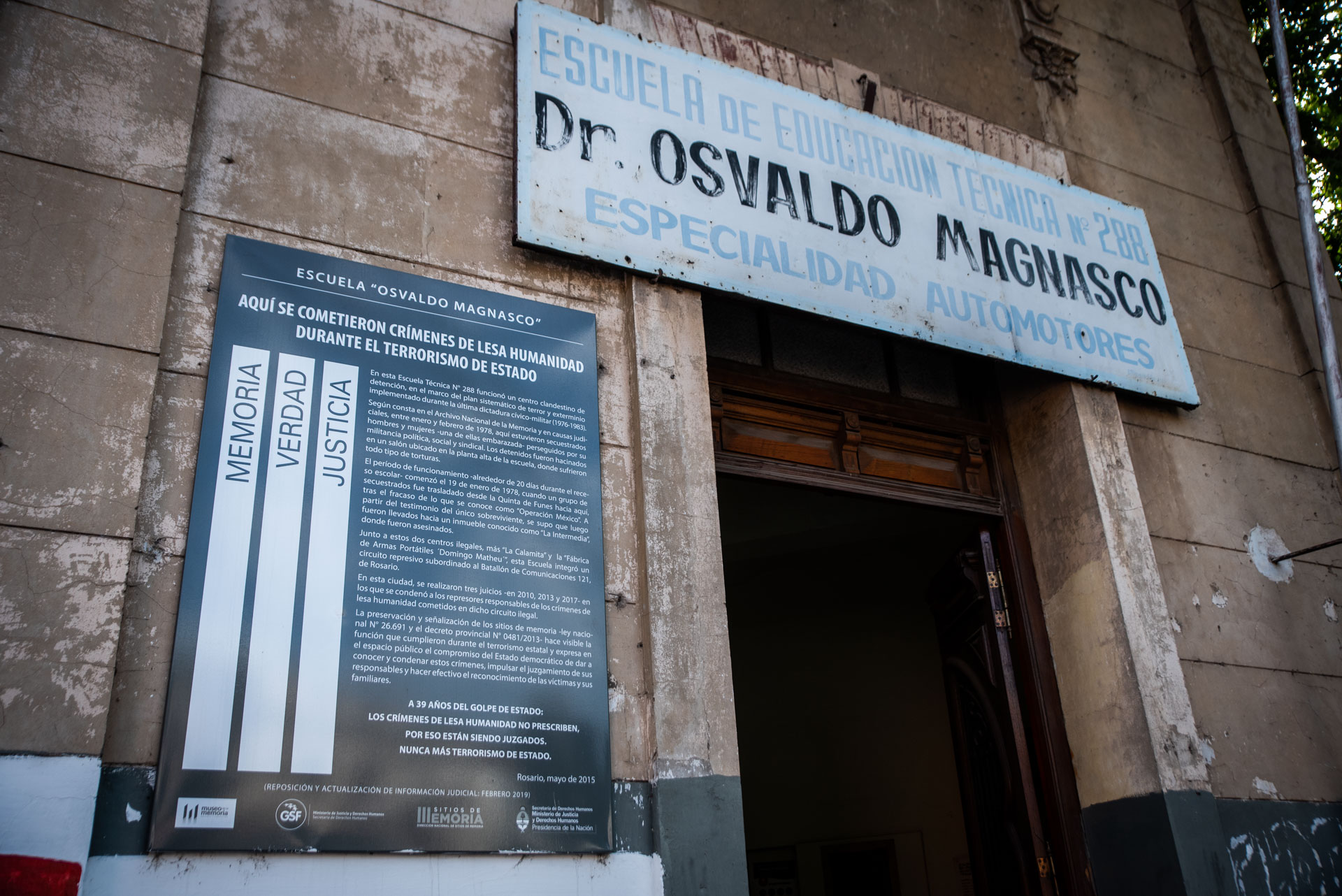 Sobre calle Ovidio Lagos a la altura de Zeballos emerge un antiguo edificio con dos carteles sobre la ochava. Uno que identifica a la Escuela Técnica Nº288 “Osvaldo Magnasco” y otro que señala al lugar como sitio de memoria. “En esta escuela funcionó un centro clandestino de detención en el marco del plan sistemático de terror y exterminio implementado durante la última dictadura cívico-militar”, rememora.