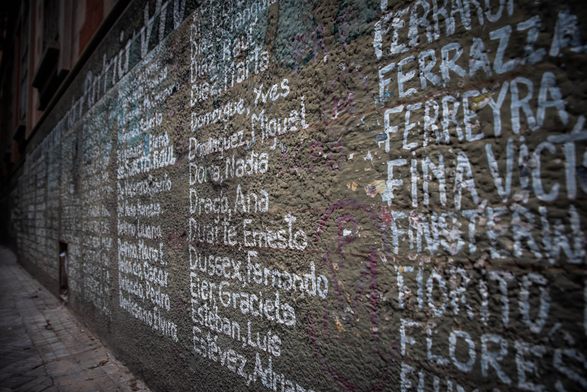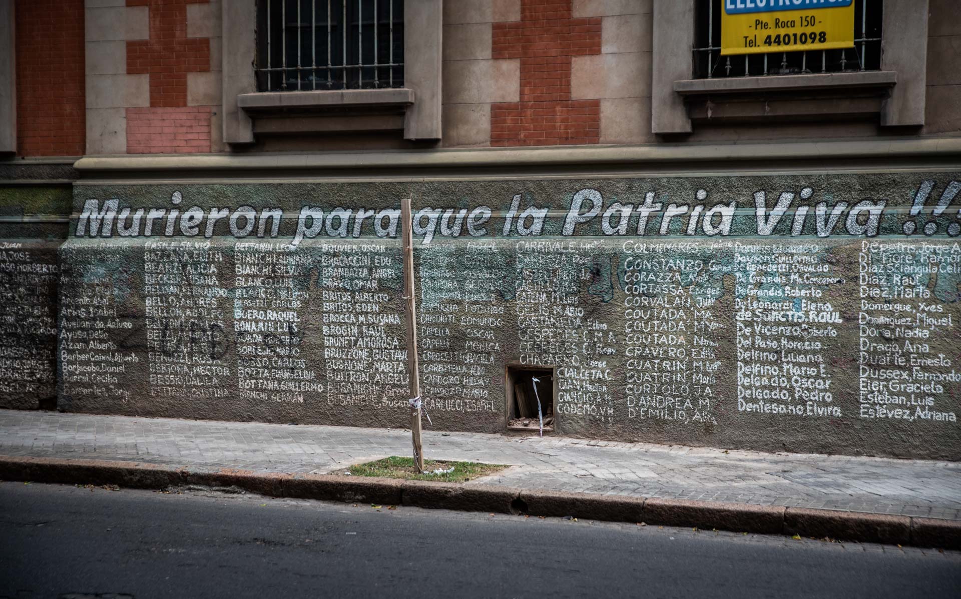 En este caso, las paredes hablan y dicen mucho: dicen el nombre de más de 400 rosarinxs asesinadxs o desparecidxs desde la resistencia peronista de 1955 hasta las víctimas de diciembre de 2001. El mural, imponente, tiene más de un metro y medio de alto por 26 de largo y está pintado sobre las paredes del Colegio San José que se encuentran en la esquina de Jujuy y España, incluyendo la ochava.