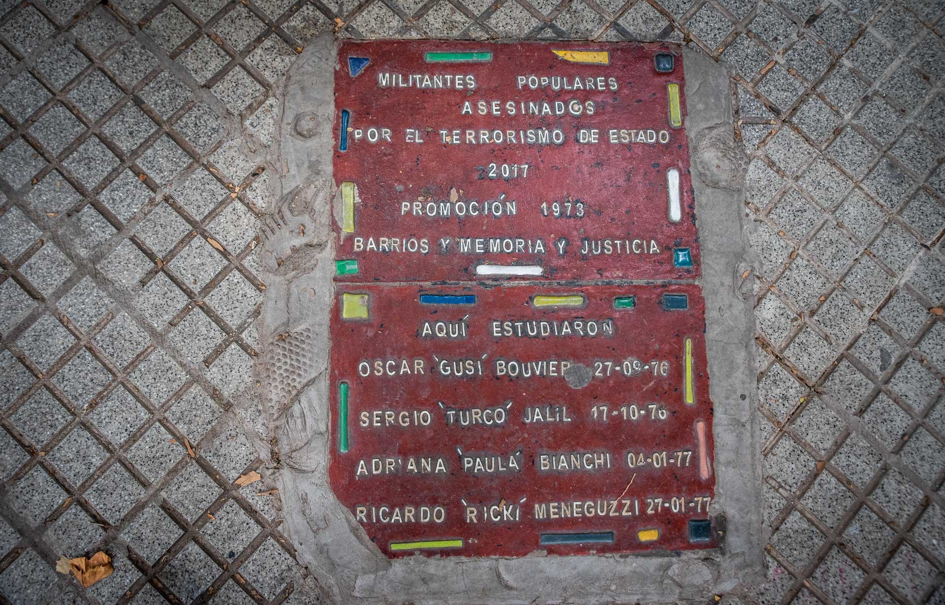 “Aquí estudiaron”, encabeza la placa de cemento colocada en Oroño al 1160, donde la promoción 1973 decidió marcar el paso de Oscar Bouvier, Adriana Bianchi, Ricardo Meneguzzi y Sergio Jalil, por las aulas de la Dante Alighieri. Todos fueron asesinados en distintos hechos ocurridos entre 1976 y 1977. La baldosa los recuerda como “Militantes populares asesinados por el terrorismo de Estado”, al mismo tiempo que invita a conservarlos en la memoria y no bajar los brazos en reclamo de justicia.