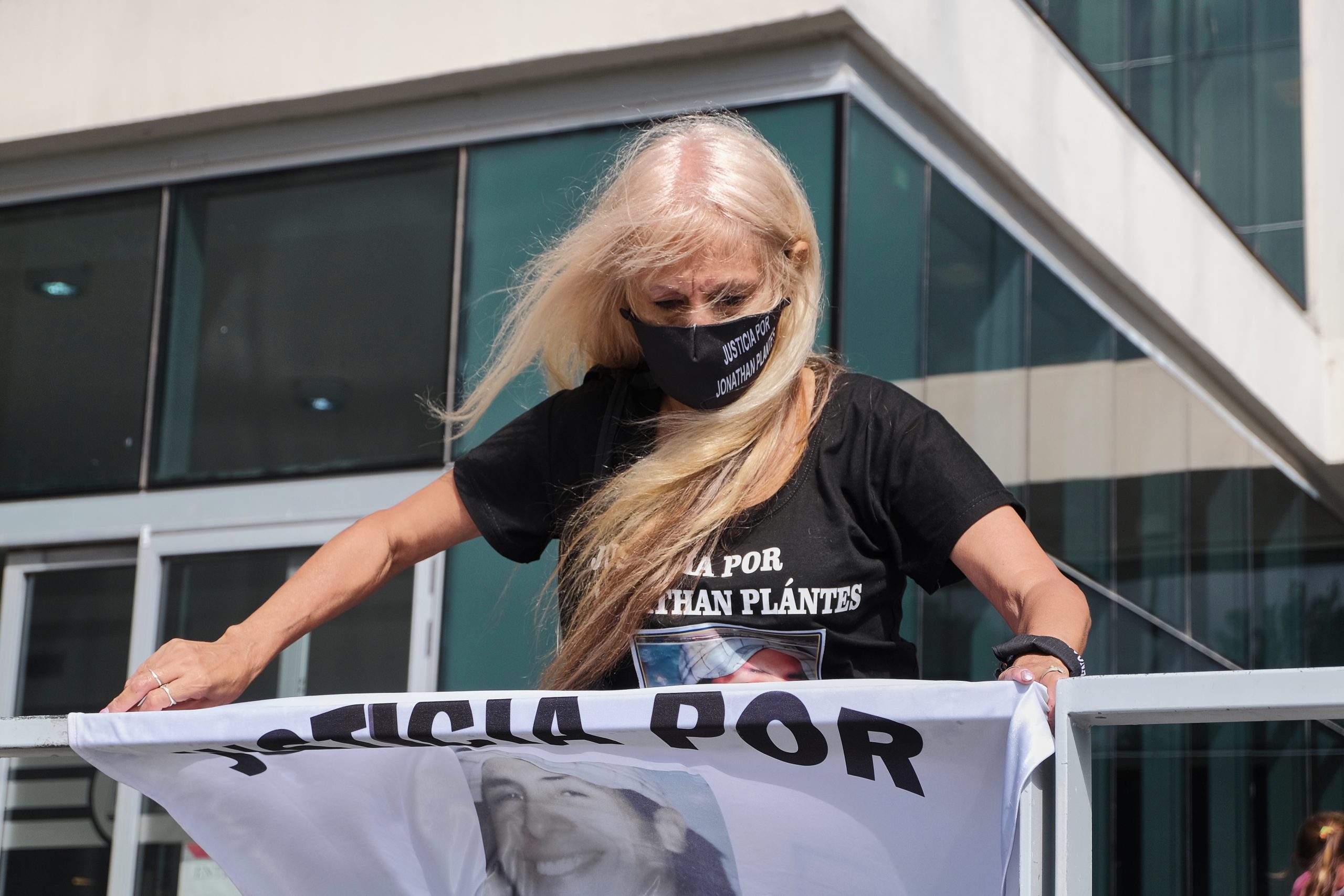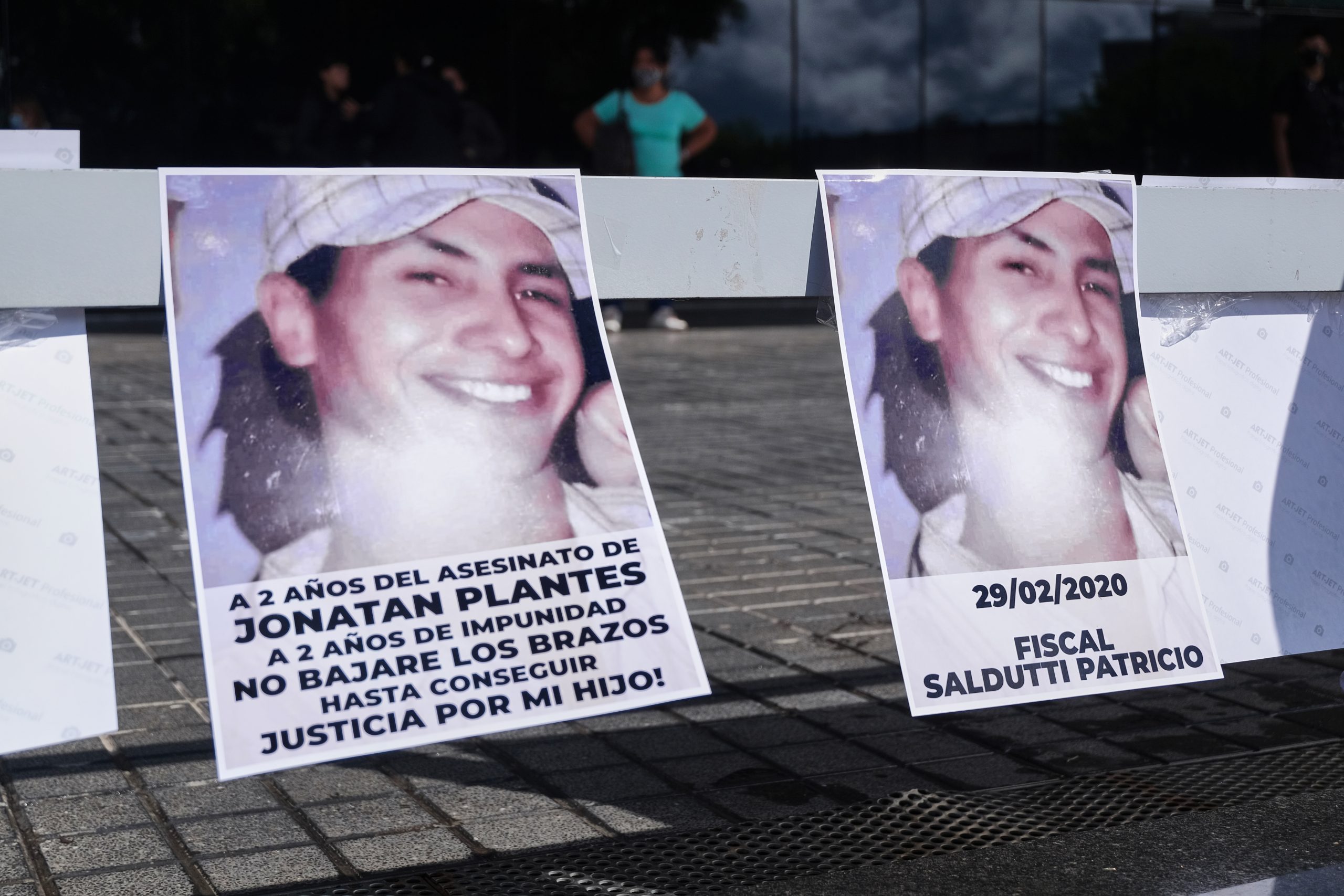 Por detrás de la escena entran y salen trabajadores del sistema judicial y personas que transitan por el lugar. Ella posa para unas fotos que después difundirá por las redes sociales, un buen aliado para multiplicar las voces cuando no se puede gritar en grupo. En su remera, en su barbijo, en el pañuelo amarrado a su mano izquierda hay algo que evoca a Jonathan. Dice que no importa cuanta gente la acompañe en sus marchas o en sus reclamos, que ella no va a bajar los brazos en su lucha.