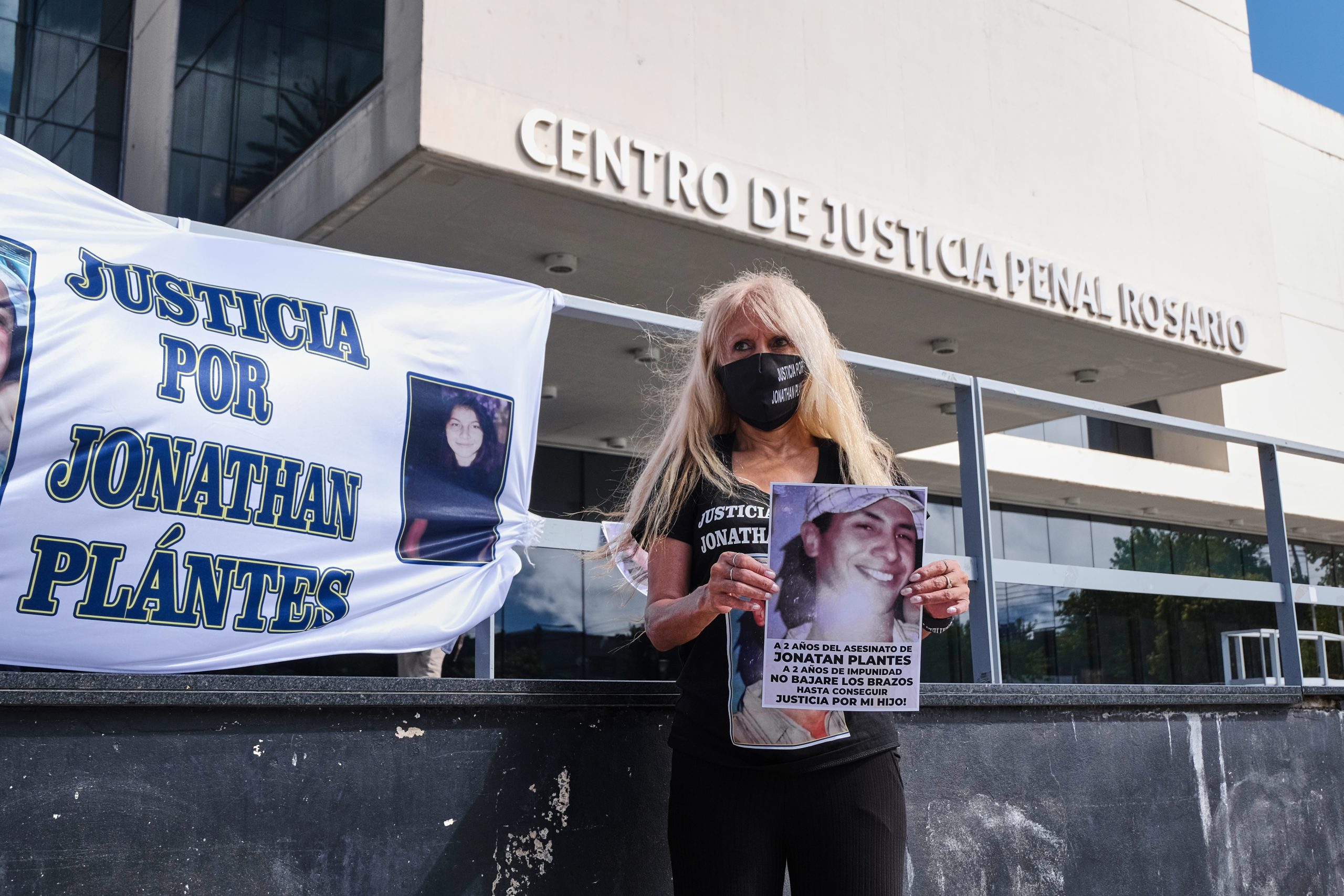 Rosa camina por la explanada del Centro de Justicia Penal de Rosario. Camina sola, como en casi todo lo que la moviliza desde hace dos años. Esta vez tampoco será recibida por ningún funcionario judicial, pero no le importa. Por eso avanza, vestida de negro, por las escalinatas del lugar para comenzar con su ritual: primero colocar las pegatinas sobre las paredes del Palacio Judicial para después colgar en soledad dos banderas con la cara de su hijo, la fecha de su asesinato, y una frase que la acompaña a todos lados: Justicia por Jonathan Plantés.