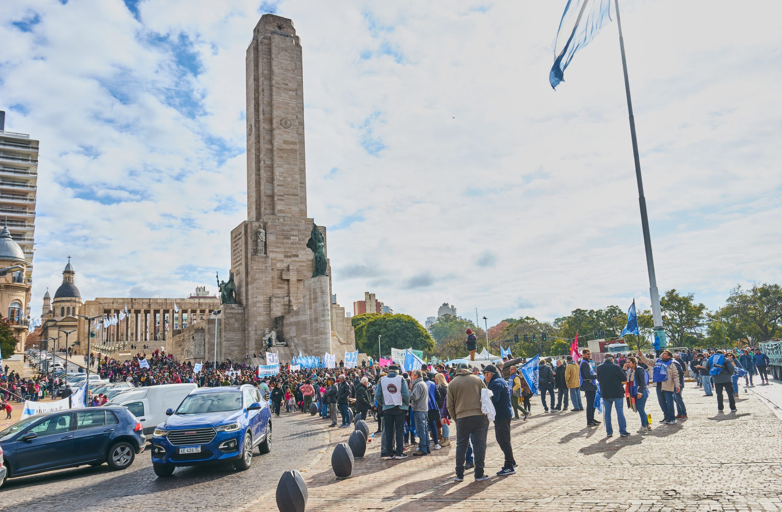 En su discurso el escritor arrastra palabras y acentúa sílabas, por si a alguien se le pasó de largo su origen chaqueño. El viento le vuela una bufanda gris que se destaca por encima de una campera violeta. No es un buen día para estar al aire libre, algo que poco le importa a las miles de personas que llegaron desde distintos puntos del país y que concentraron en el Monumento a la Bandera para después marchar por las calles del centro de la ciudad en una caravana que fue tan masiva como ruidosa.