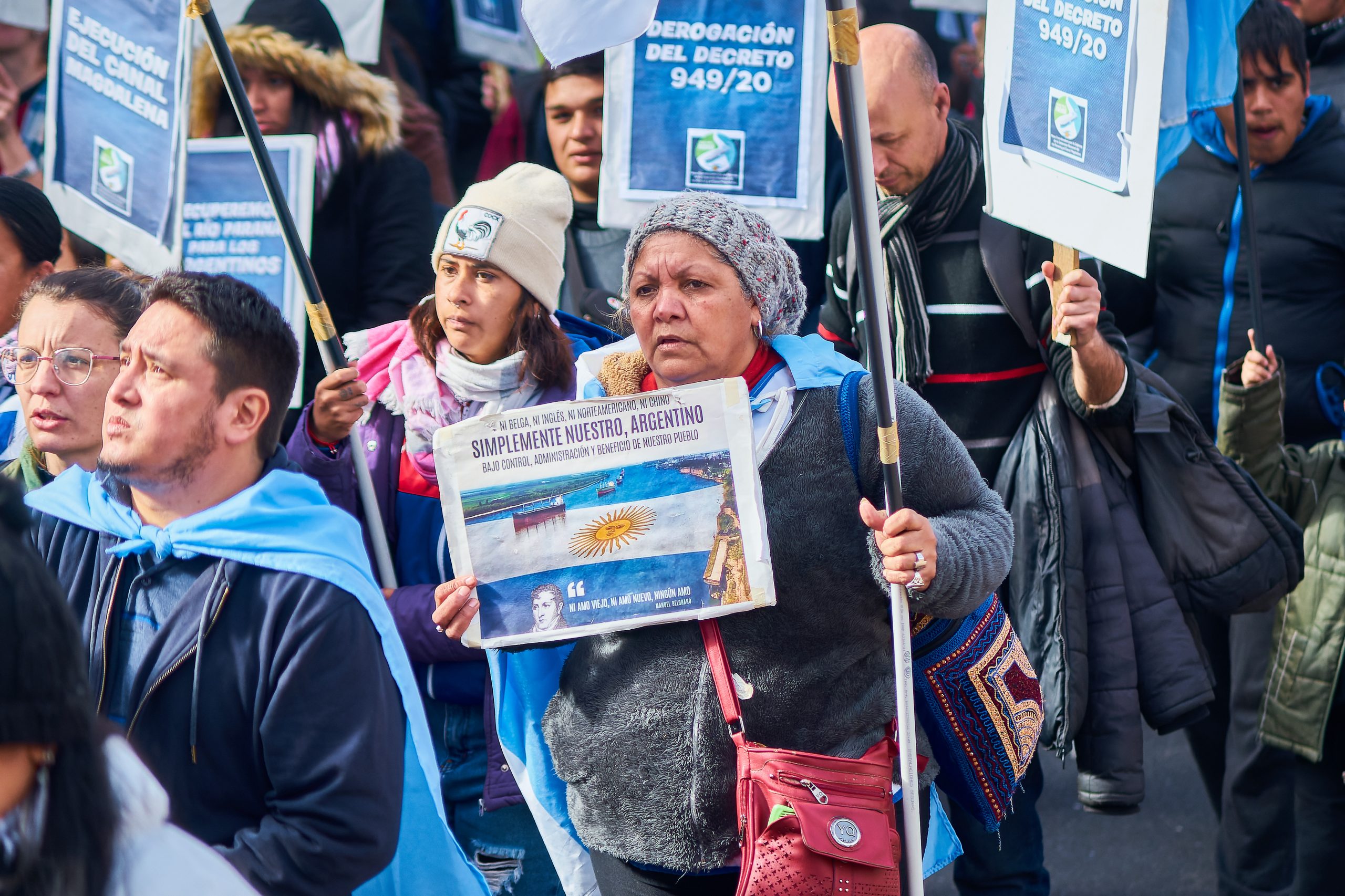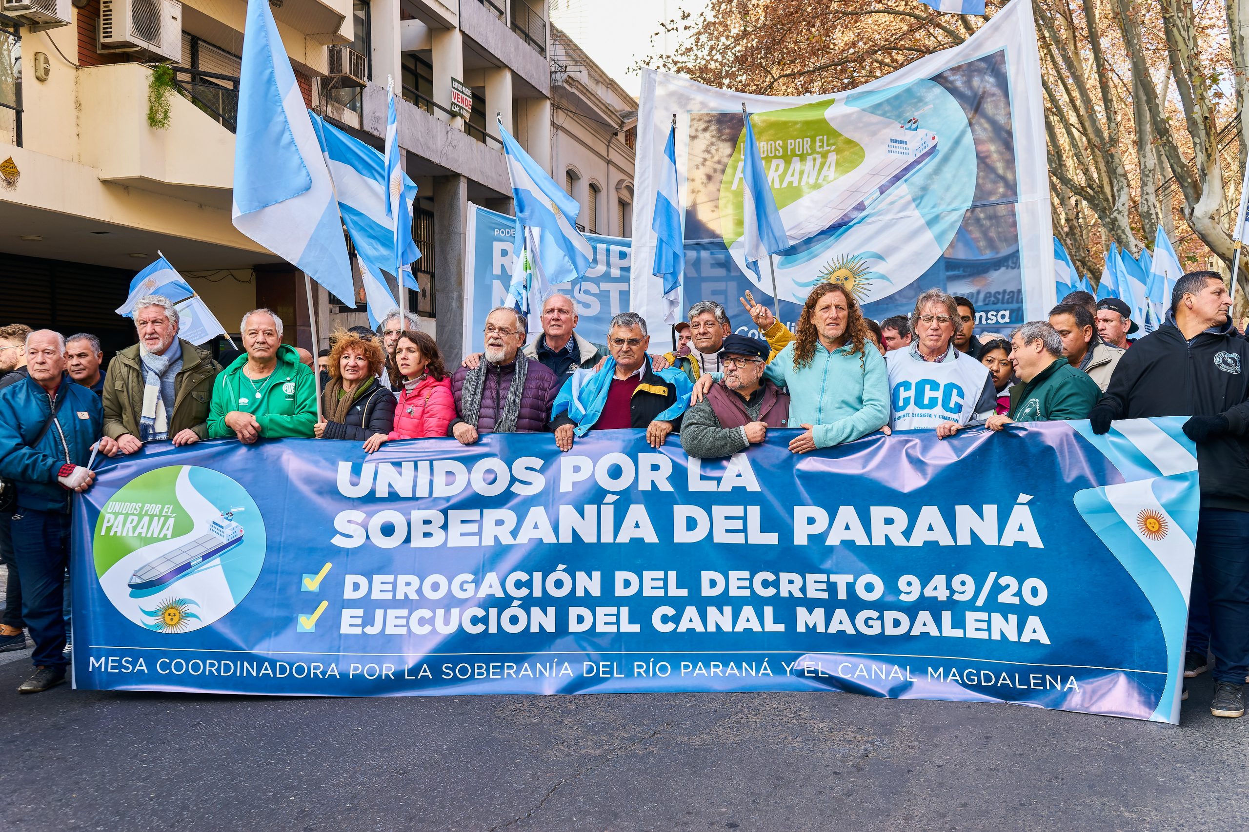 Organizaciones sociales, políticas, sindicales. Las diversas corrientes de la Central de Trabajadores de la Argentina, los referentes de la Confederación General del Trabajo con una fuerte impronta de los camioneros. Sectores históricamente diferenciados marchando en conjunto para reclamar que el Estado recupere la soberanía sobre el río Paraná. Eso, que parece un concepto abstracto, se apoya en dos consignas concretas: por un lado la derogación del decreto 949 del 2020, con el que el gobierno nacional abrió las puertas a una nueva licitación para la señalización, dragado y balizamiento del río; y por otro, el pedido de construcción del canal Magdalena, para que los buques tengan una entrada y salida directa al mar sin tener que pasar por el puerto de Montevideo.