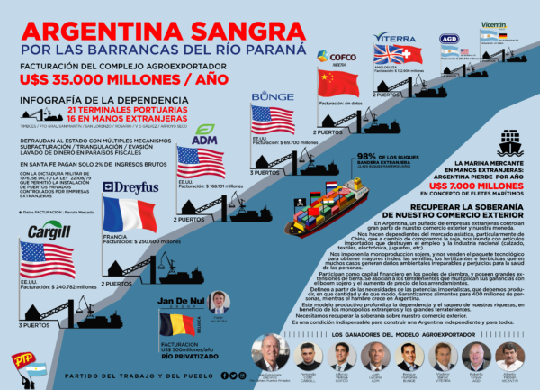 Para Orellano los puertos son “verdaderos enclaves coloniales” a las que hay que ponerle nombre y apellido. Por eso las menciona en orden: las norteamericanas ADM, Bunge y Cargill; la fracesa Dreyfus; la estatal COFCO de origen chino y la anglosuiza Glencore que se quedó con Renova, la planta de molienda más grande del mundo ubicada en Timbúes. Pero también hay firmas argentinas como Vicentín, AGD y Molinos agro, entre otras. Sobre este conjunto de empresas versan las sospechas de defraudación al Estado a través de mecanismos como la subfacturación y la triangulación.