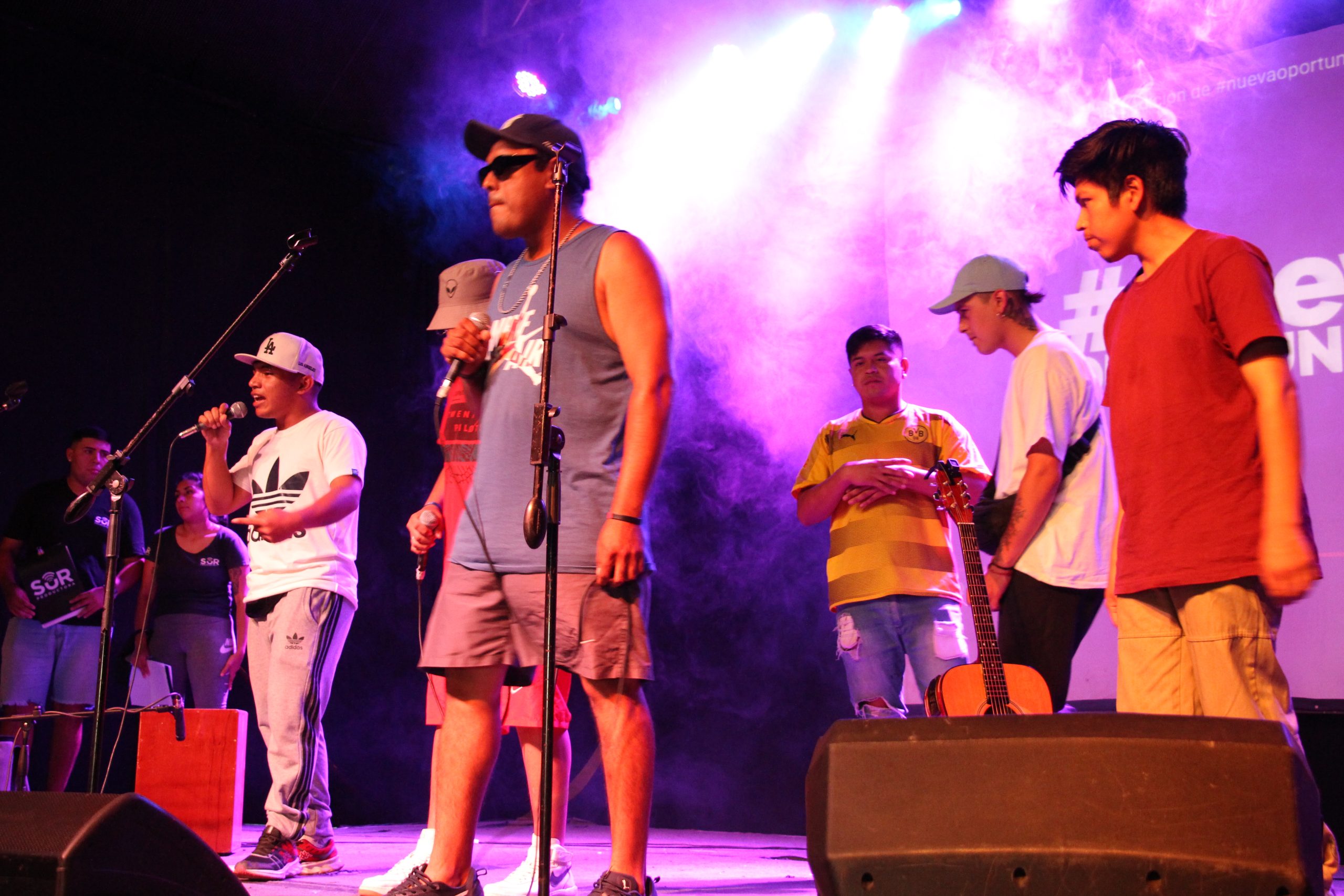 – Ahora sí, arrancamos con todo el flow- anuncia desde arriba del escenario Marcelo Torres, integrante de Sur Productora, un proyecto de comunicación surgido desde las entrañas de Las Flores. Camino a conformarse como cooperativa, este grupo de jóvenes tiene doble tarea en la Hiphopiada: conducir el evento –Marcelo hace dupla con Micaela Gómez- y registrar fotográficamente todo lo que sucede, tanto arriba como abajo del escenario.