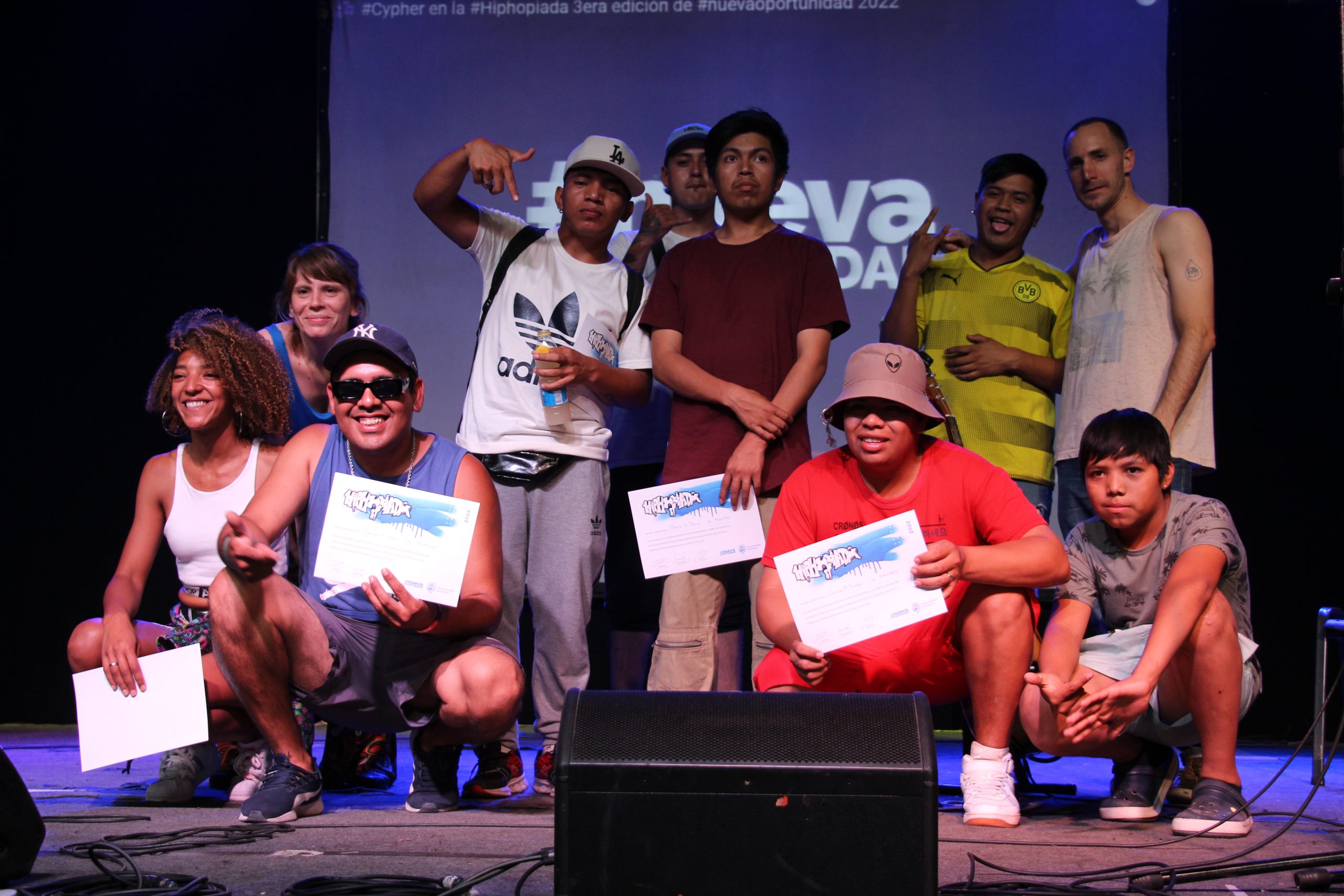 La ronda espontánea es para ponerse de acuerdo sobre lo que pasará un ratito después arriba del escenario: afinan detalles, concentran, repasan algunos pasajes de la canción grupal que grabaron ayer en un estudio y que hoy presentarán en vivo en el marco de la 2° Hiphopiada, muestra anual municipal que reúne a diversos grupos de jóvenes que se organizan alrededor del hip hop en las barriadas de Rosario. Los pibes que rondan son del BT Crew de zona oeste.