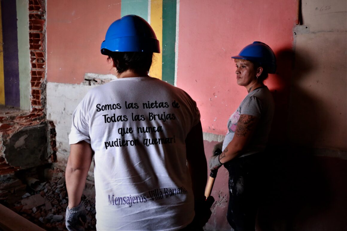 En Villa Banana, la casita histórica de Mensajeros de Jesús recuperó vida a partir del 2017. Allí, mujeres del barrio reabrieron el lugar y fundaron la cooperativa Aquelarre que hoy cuenta con una cuadrilla de albañilas encargada de acondicionar el espacio. Mientras construyen la cocina, sostienen talleres de costura y carpintería. Los sueños, el canto bajo el sol y la lucha diaria en medio de un contexto desolador.