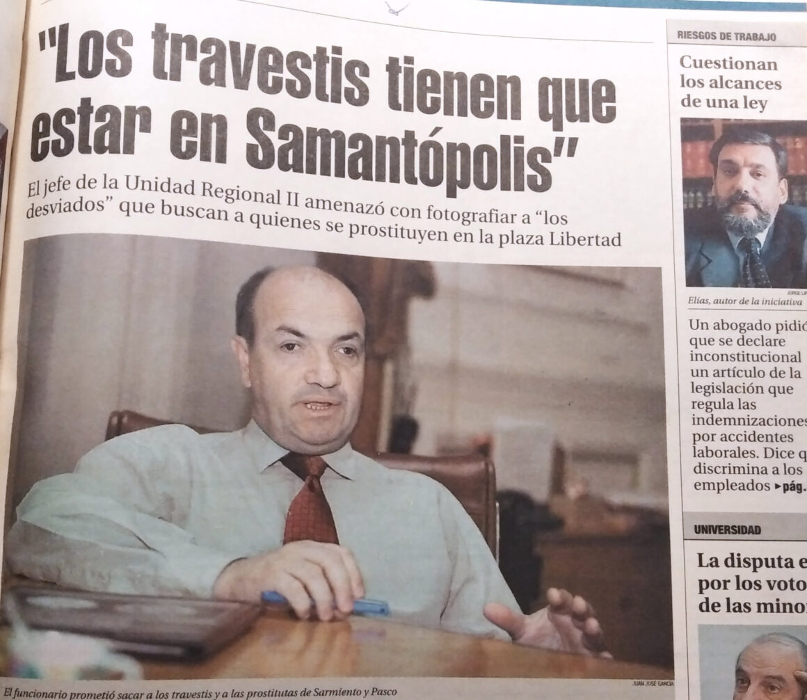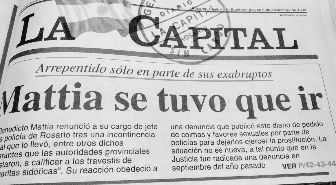 El villano, y mal actor por si no se dieron cuenta, era un tal Benedicto Mattia, un jefe de policía presentado como ‘moderno’ cuya incontinencia verbal lo llevó a declarar que las denunciantes eran “mascaritas sidóticas”. Según dijo después, “le subió un calorcito” al ver a las chicas develando la trama de las coimas nocturnas que no vaciló en vomitar su odio para legitimar públicamente las razzias policiales neofascistas que sostenía como práctica cotidiana. Había que asegurar la caja policial y mantenerlas en los márgenes de la democracia. Porque de eso se trataba: de impedir que el colectivo de la T saliera de la dictadura.