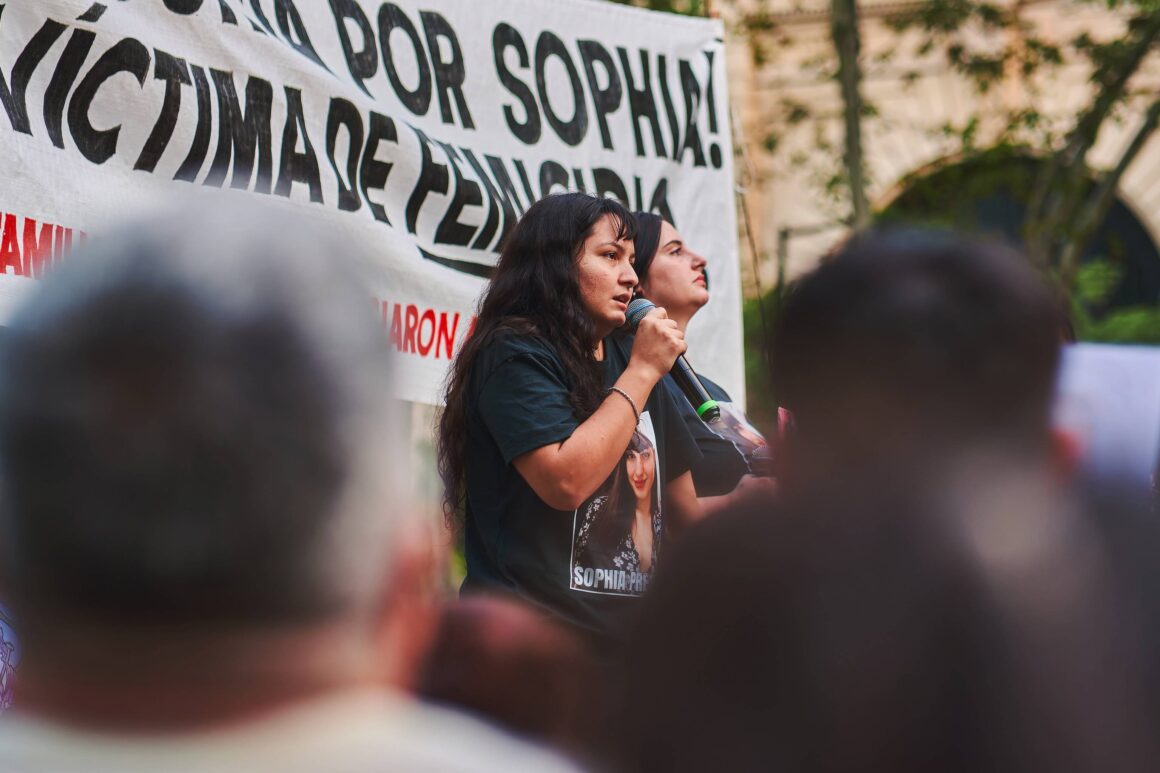 “Venimos a levantar su memoria para que su recuerdo no se apague nunca” dijo su hermana entre llanto, y enfatizó su descontento con la cobertura mediática: “Quiero hacer un descargo público del mal manejo de algunos medios que por tener una primicia se olvidan del respeto y del dolor de la familia. A pocas horas de que todo esto saliera a la luz ya estaban con sus hipótesis y las fotos junto al asesino”. Sus primas le dieron luz a una Sophía compañera, amiga, hermana. “Sophi es carácter y ternura. Sophi es un te quiero, un cuídate y avísame cuando llegues. Mientras haya memoria, Sophi sigue siendo” y agregaron: “A ella le quitaron la voz, y eso es lo más doloroso. Necesitamos que esto no pase más. Ninguna familia debería pasar por este dolor. Vamos a seguir pidiendo justicia y a todos los que están escuchando les pedimos que no se queden en silencio. Hablen, acompañen, intervengan, porque el silencio también mata”.