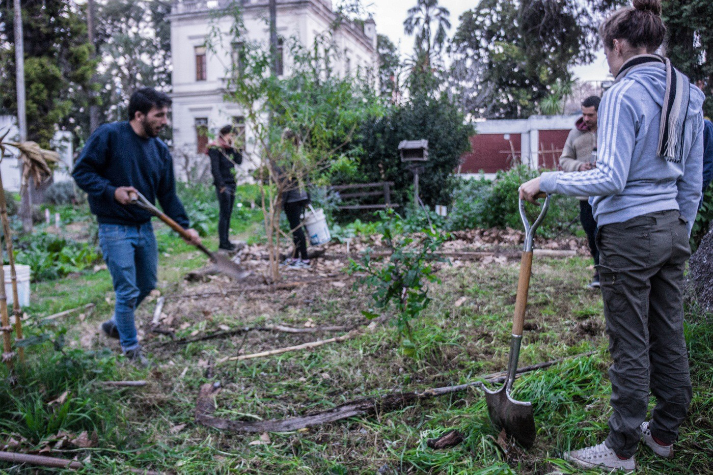 El jardín que se asoma por Bulevar Avellaneda cruza lo profundo del terreno. En ese frente se destacan unos arbustos, unas palmeras, otros arbolitos: el paisaje habitual de cualquier espacio verde. Sobre el sector que linda con calle Río de Janeiro el aspecto cambia. Árboles distintos, plantas con flores coloridas, parcelas de tierra removida, un invernadero enorme, varios tachos de doscientos litros, un par de carteles que indican especies de las plantas y algunas tareas por hacer. Y, claro, gente haciendo. Es el aspecto inicial que naturalmente ofrece la organización Flor de Huerta cuando se la visita sin previo aviso. Es un miércoles de julio, apenas pasan las cuatro de la tarde, el sol lleva varias horas entibiando el invierno. Es día de minga y las manos están en la tierra.
