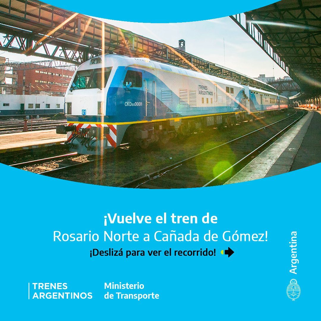 En la nota televisiva se ve a un hombre que sonriendo de frente al sol sostiene entre sus manos un cartel indicador: Rosario-Cañada de Gómez. Lo mantiene en alto para asegurarse de mostrarlo a la cámara. Después lo da vuelta: Cañada de Gómez-Rosario. Ida y vuelta es el recorrido diario de la conexión del tren de cercanía que se restablecerá después de cuarenta y cuatro años. Sol pleno en la mañana del 4 de mayo, en la antesala de la marcha blanca: el viaje de prueba que se realiza antes del primer viaje oficial y que en esta oportunidad también se convierte en viaje protocolar con la presencia de la prensa y de funcionarios nacionales, provinciales y municipales de cada una de las comunas en donde el tren tendrá sus paradas intermedias: Correa, Carcarañá, San Gerónimo, Roldán, Funes y Fisherton.
