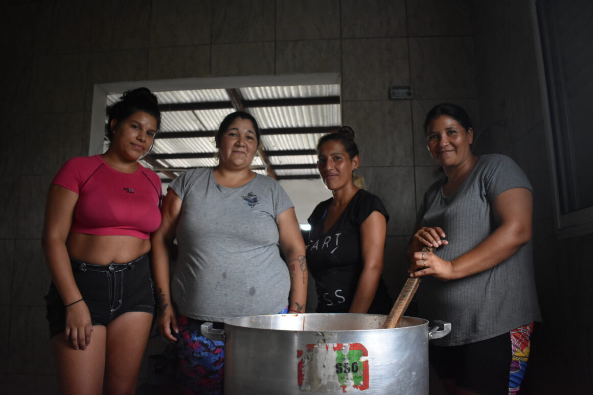 Un rato después encenderán el fuego. El aire húmedo y caliente empieza a oler a cebollas y a pimientos, a vapor de guiso. Dos grandes ollas sobre los quemadores, dos garrafas de diez y una pequeña piecita con paredes de cerámica. Más allá, tres piecitas más, donde se planifica construir un baño para varones y otro con accesibilidad para personas con discapacidad. Pero la obra está frenada por la falta de recursos.